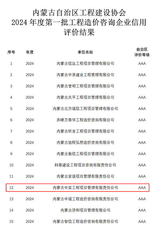2024-07-3014939 次近期,我公司参加内蒙古自治区工程建设协会组织的“2024年度第一批工程造价咨询企业信用”申报,获得“信用AAA级证书”。我公司成立多年以来,遵循中国工程造价管理协会对造价咨询企…